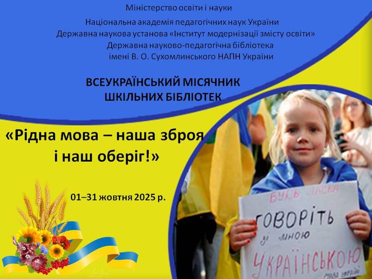 Всеукраїнський місячник шкільних бібліотек у 2025 році, як і в попередні роки, у нашому закладі проходитиме з 1 по 31 жовтня. Цей місячник є частиною Міжнародного місячника шкільних бібліотек, який щорічно відзначається в жовтні. Тема Всеукраїнського місячника шкільних бібліотек у 2025 році "Рідна мова – наша зброя і наш оберіг!"